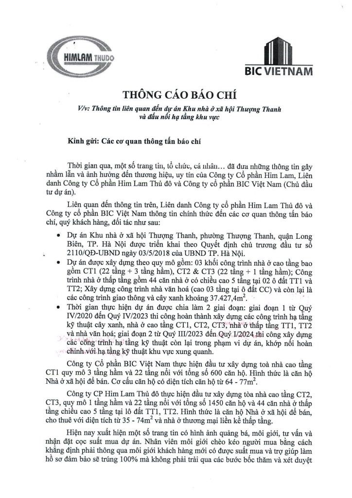 Thông cáo báo chí về việc thông tin liên quan đến dự án Khu nhà ở xã hội Thượng Thanh và đầu nối hạ tầng khu vực08:19 - 28/01/2022Tin tức, Tin thị trường, Tin công ty, Chia sẻ:
